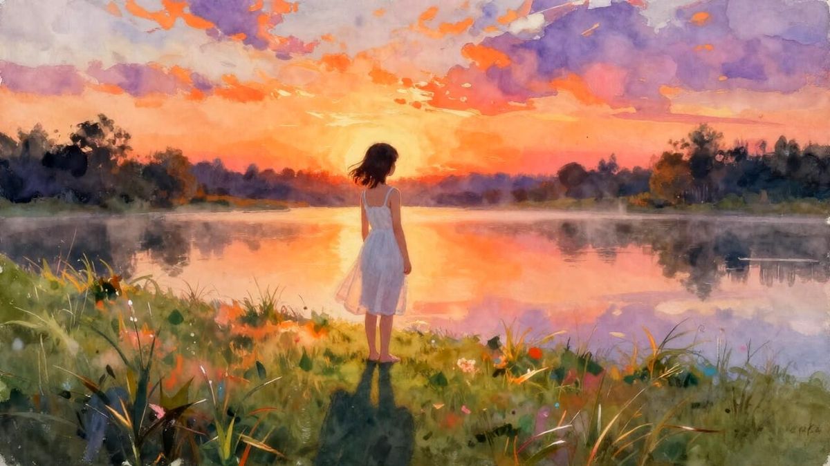 This image shows a vibrant landscape with a girl looking at a calm body of water during a colorful sunset, evoking a sense of peace and tranquility.