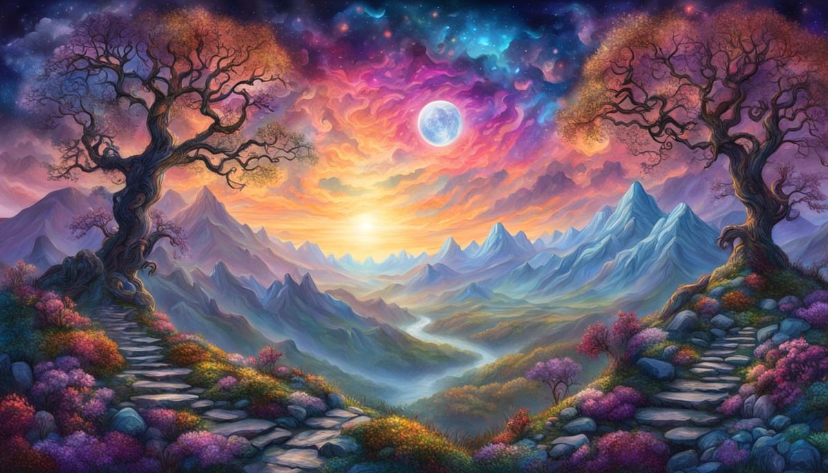 This image depicts a mystical scene of blooming trees, shrubs, and flowers in a serene mountainous landscape. The vibrant colors and intricate details evoke a sense of enchantment and otherworldliness, characteristic of gothic and hypermodern art. A soft, ethereal light bathes the scene, evoking a sense ...