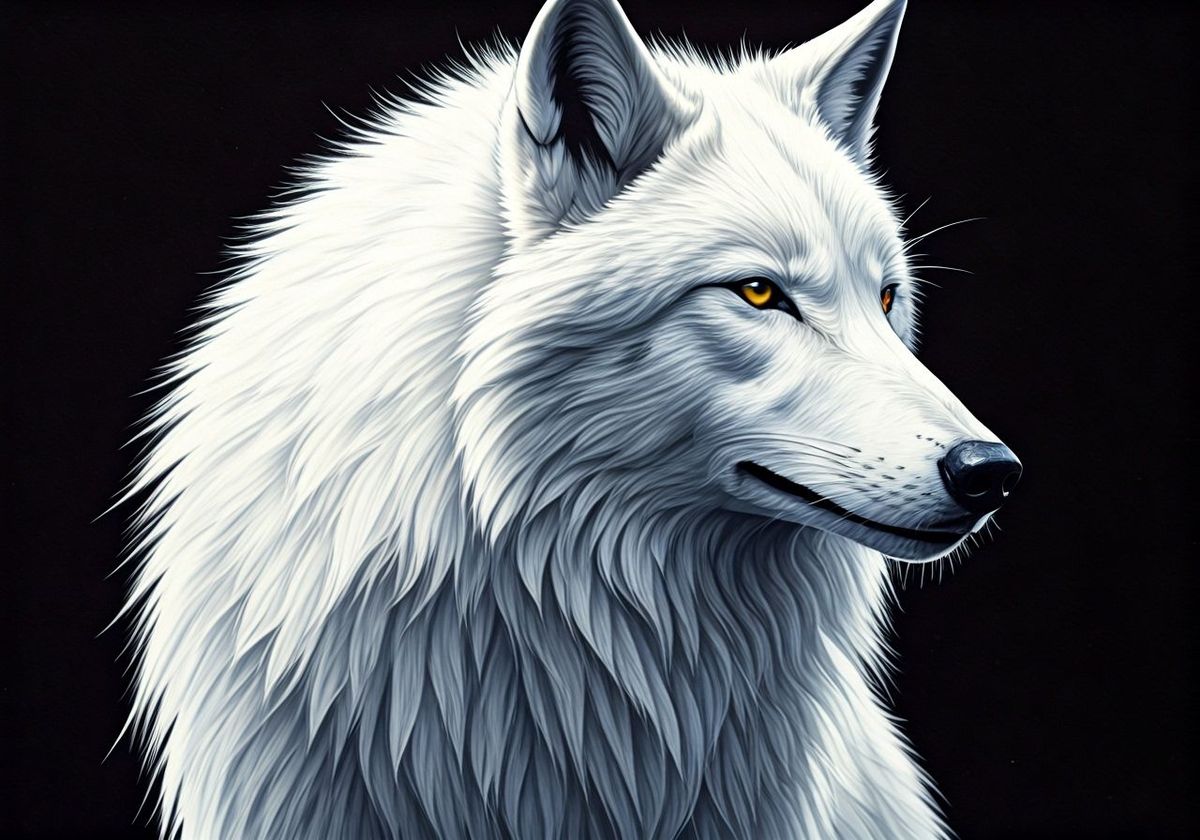 This image shows a majestic white wolf in a full body pose. The artwork features delicate and intricate details, resembling a detailed ink drawing with fantasy art elements.
