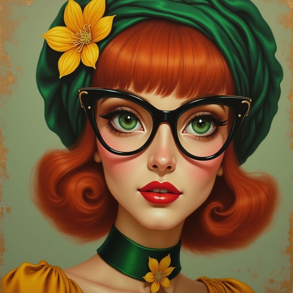A striking image of a woman in her forties wearing glasses and a turban. The artwork evokes a retro oil painting aesthetic with warm tones and a blurred background, creating a dreamy atmosphere.