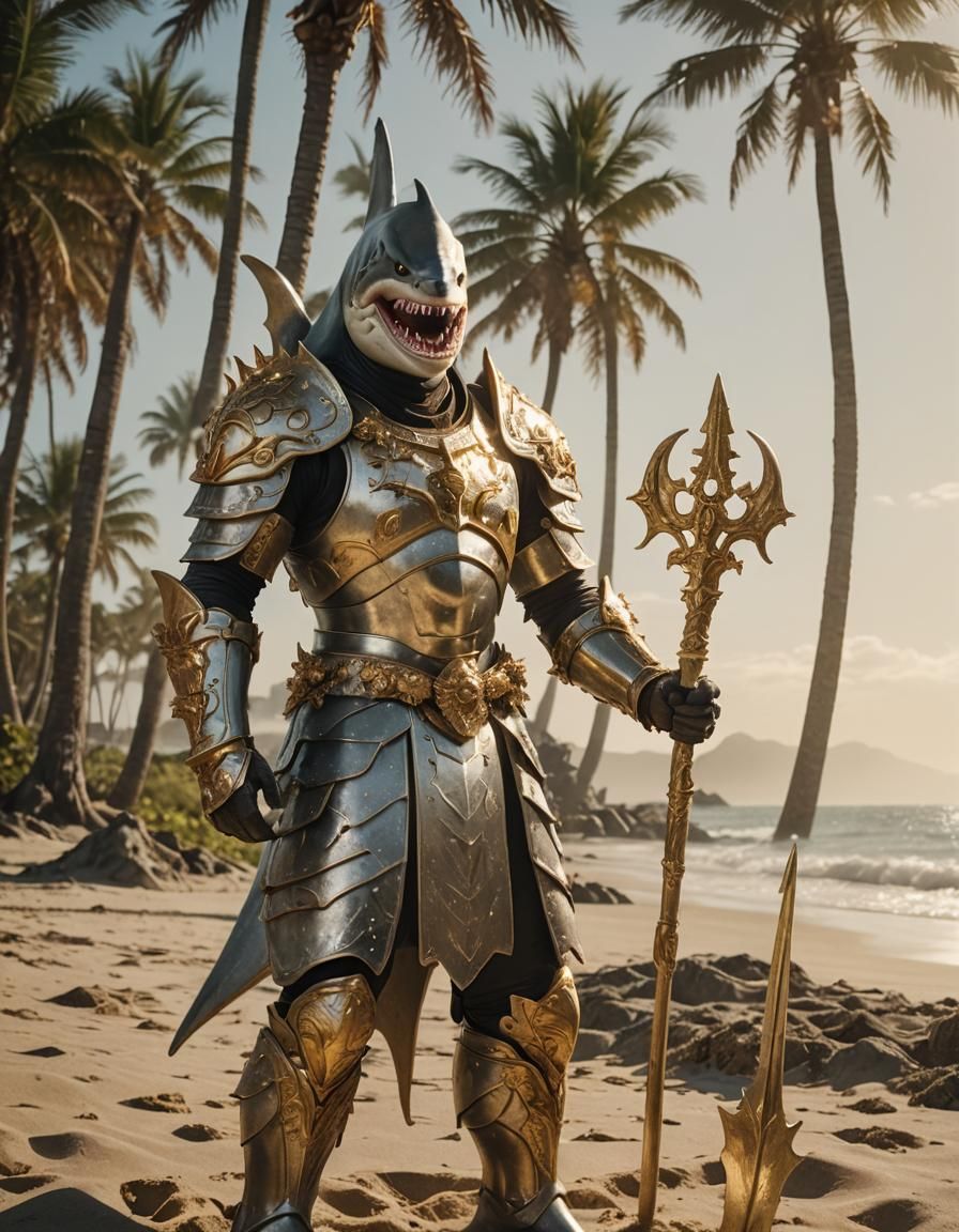 This image shows a shark-like humanoid paladin on a beach. He is clad in decorated silver armor and holds a golden trident. The scene is lit with warm sunlight in a cinematic style.
