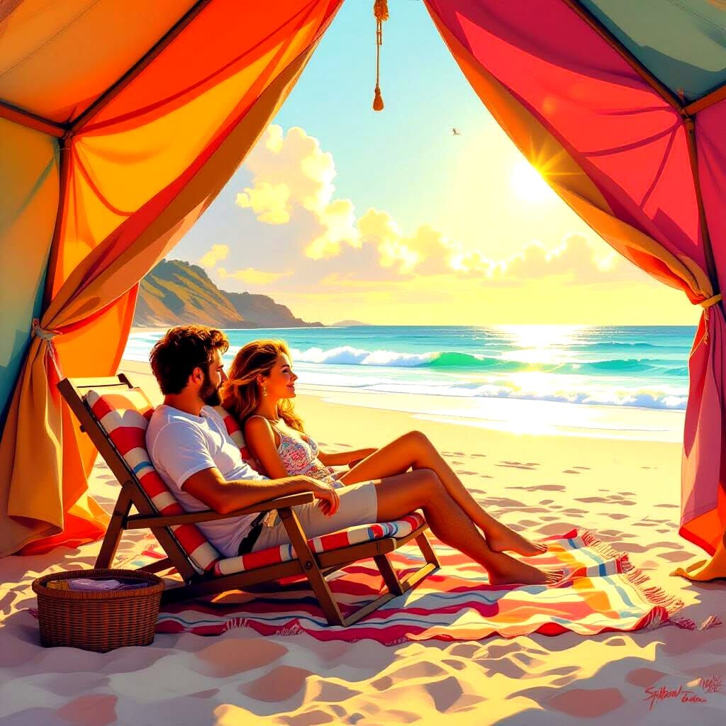 This realistic image shows a man and woman enjoying a sunny day relaxing on the beach in a tent, with a deck chair nearby, conveying a sense of beauty and tranquility.
