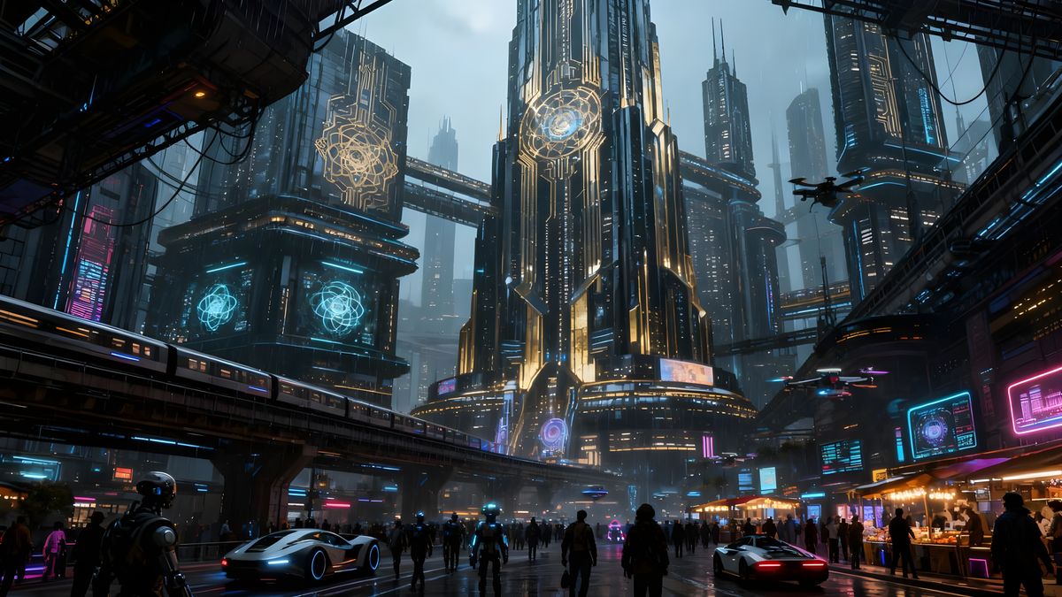 This image depicts a detailed panoramic view of a futuristic 3800 AD megacity, showcasing towering Neo-Skyscrapers and ethereal, temple-like structures in a cyberpunk style.