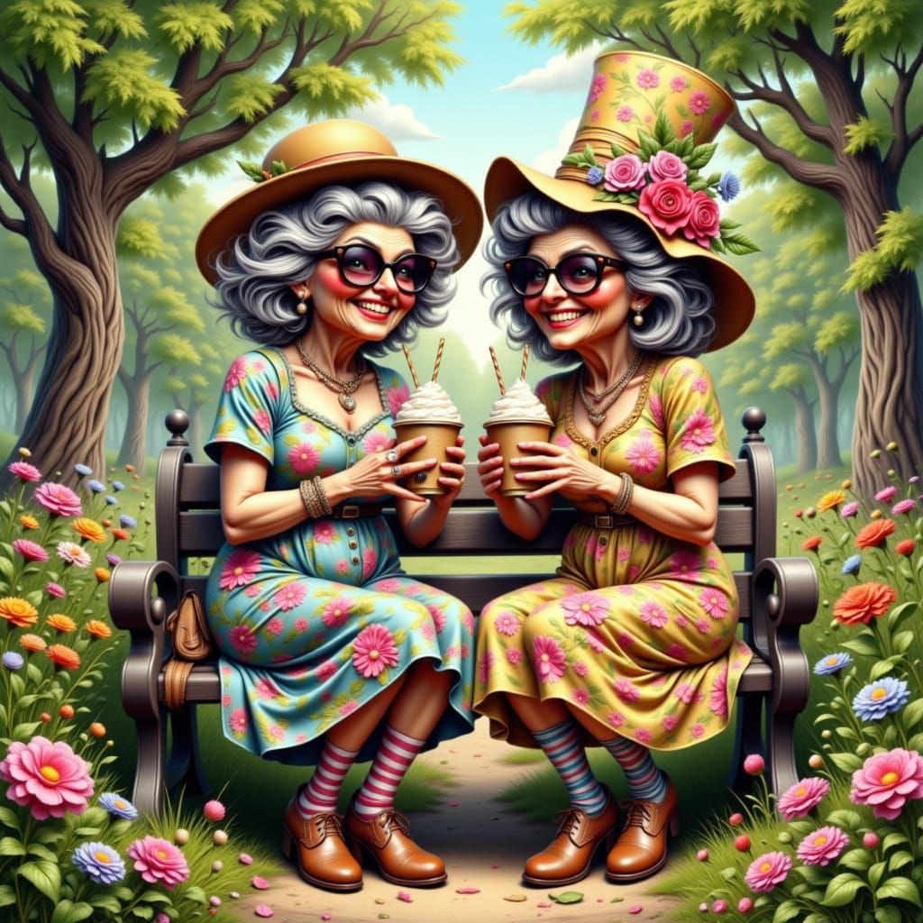 This vibrant digital painting depicts two elderly women, dressed in colorful floral attire, sharing iced coffees in a lush green park surrounded by blooming flowers and tall trees, captured in a playful and whimsical style reminiscent of Loish and Rovina Cai.