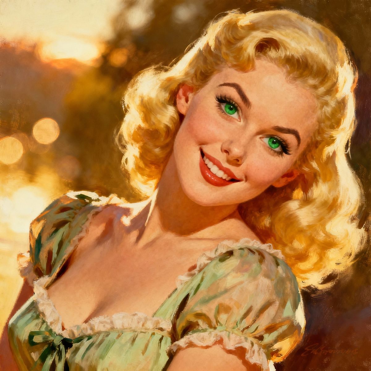 This image features a charming blonde woman with green eyes, playfully posing in a vintage dress. The scene captures a classic pin-up aesthetic with warm, soft lighting and a golden hour glow.