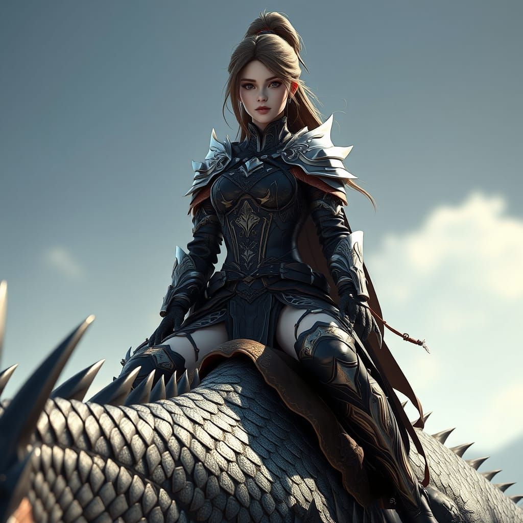 A striking picture of a female rider in leather armor sitting on a dragon. The scales glisten in the light, rendered as 3D anime art with ultrafine detail and aesthetic concept art.