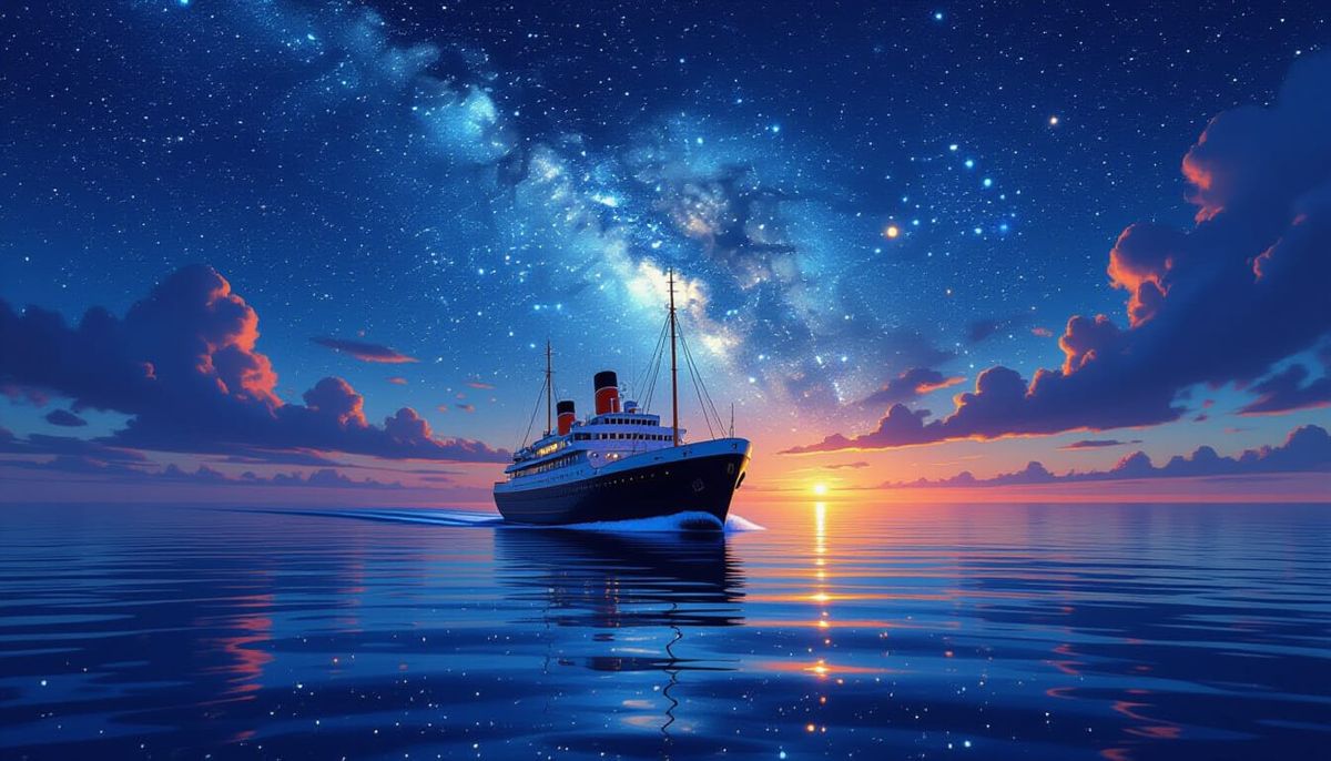 A breathtaking picture of a ship sailing on calm waters under a galaxy of stars. The image is rendered with dramatic lighting and hyperrealistic detail in a science fiction aesthetic.
