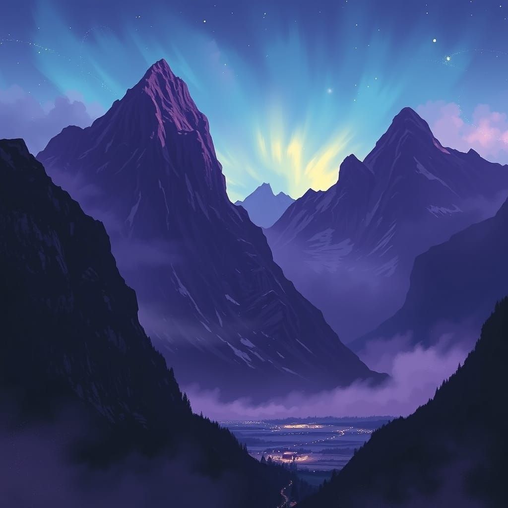 This image shows majestic mountains under a dark purple night sky with a touch of pale turquoise and lemon. A small village glows in the distance, its lights twinkling like stars.