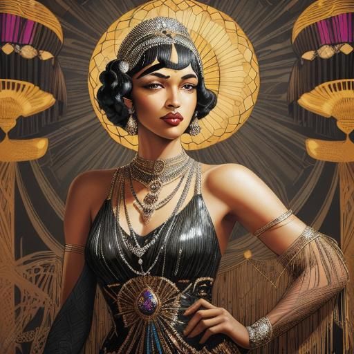 A striking picture of a woman in a flapper dress. This art deco illustration features cubism and geometric patterns, reminiscent of comic book art with vibrant colors and metallic sheen.