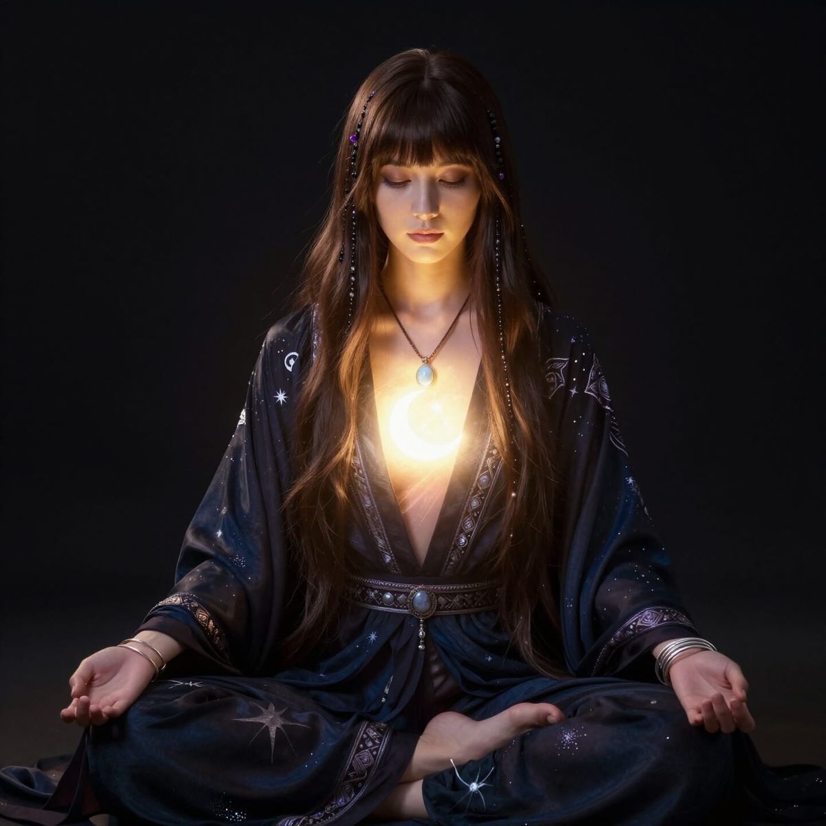 A photorealistic image of a woman meditating in darkness, her inner spark glowing with warm golden light. She wears midnight navy robes with silver embroidery and moonstone jewelry.