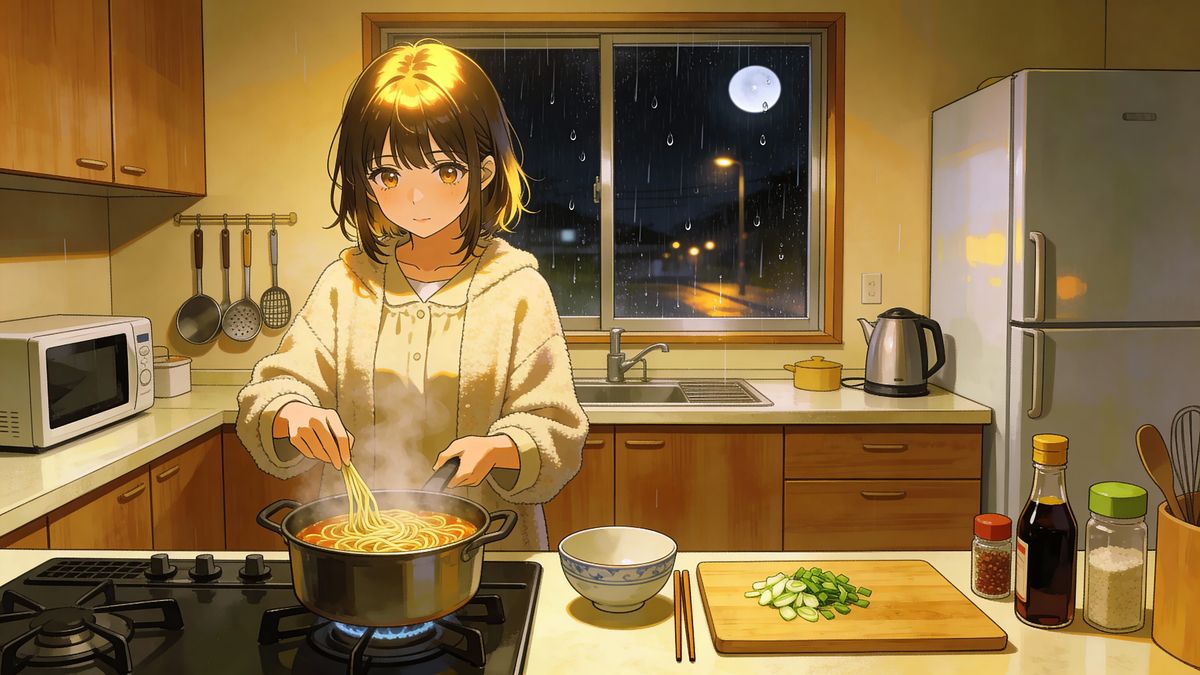 A cinematic anime scene of a girl cooking ramen in a cozy Japanese kitchen at night. Gentle rain falls outside, creating a peaceful atmosphere illuminated by warm indoor lights.