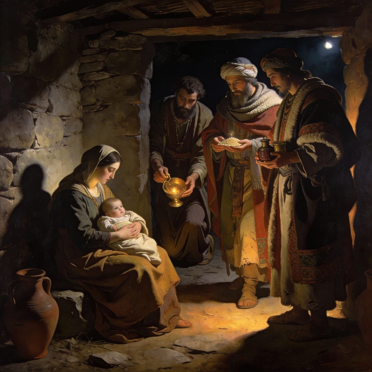 An oil painting of a night-time scene of the Magi arriving at the dwelling of the Holy Family in Bethlehem, set in the early 1st century Judea. Mary sits beside the infant Jesus, wrapped in simple, earth-toned garments, Joseph standing nearby in humble, worn clothing. The setting is a modest stone shelter, ...