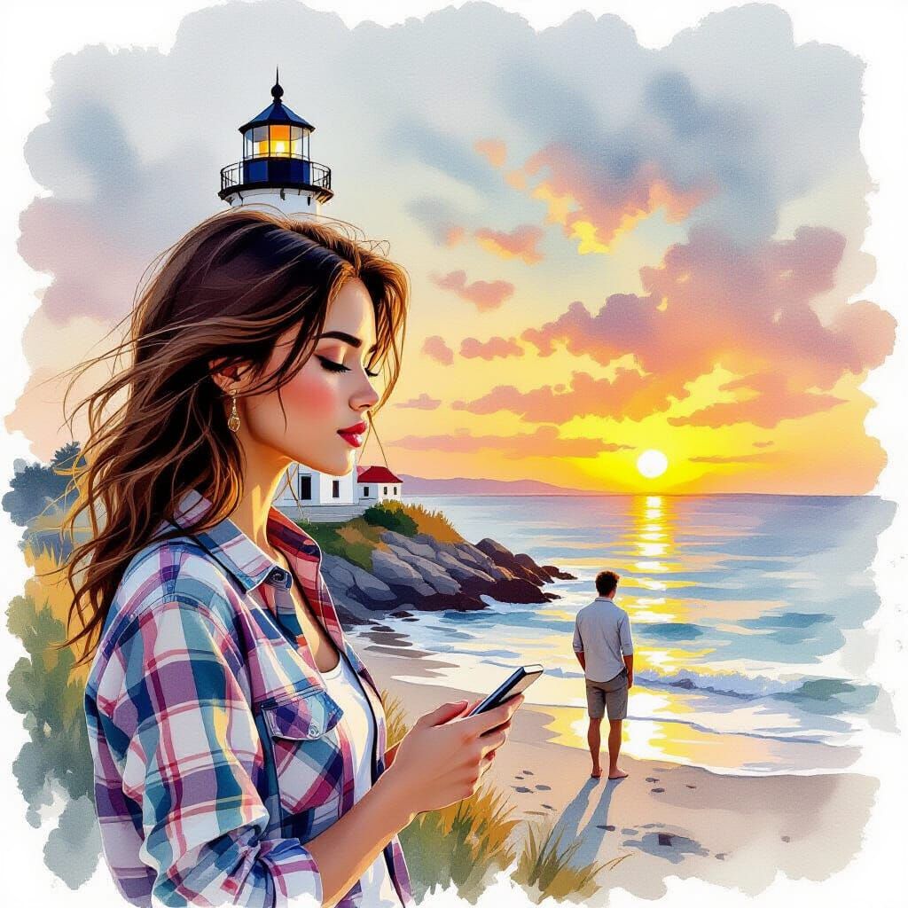 This image shows a detailed watercolor and ink seascape with a lighthouse, a woman in profile, and a man during a summer sunset. The art blends styles with thick, textured layers.