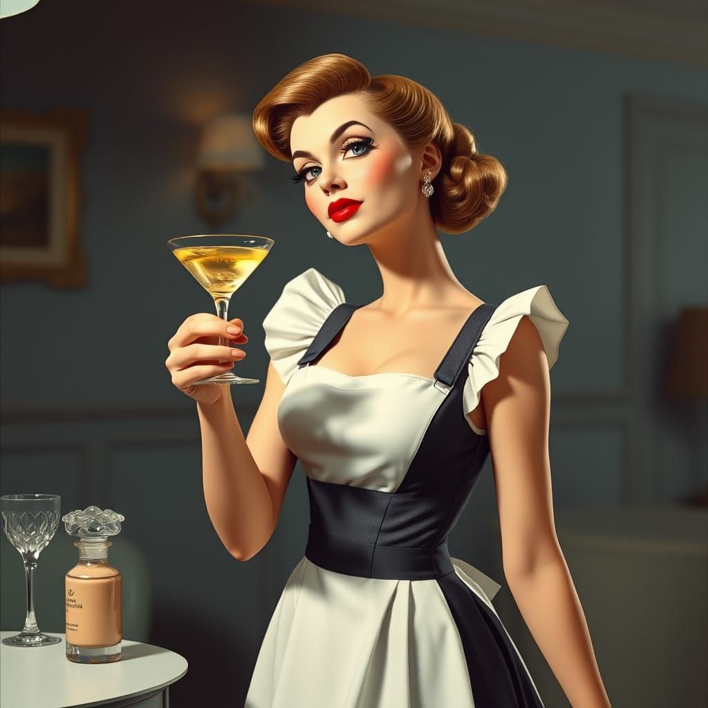 This image shows a woman dressed as a 1950s-style French maid holding a martini. The artwork features high-contrast lighting and muted colors, with exaggerated features in a vintage style.