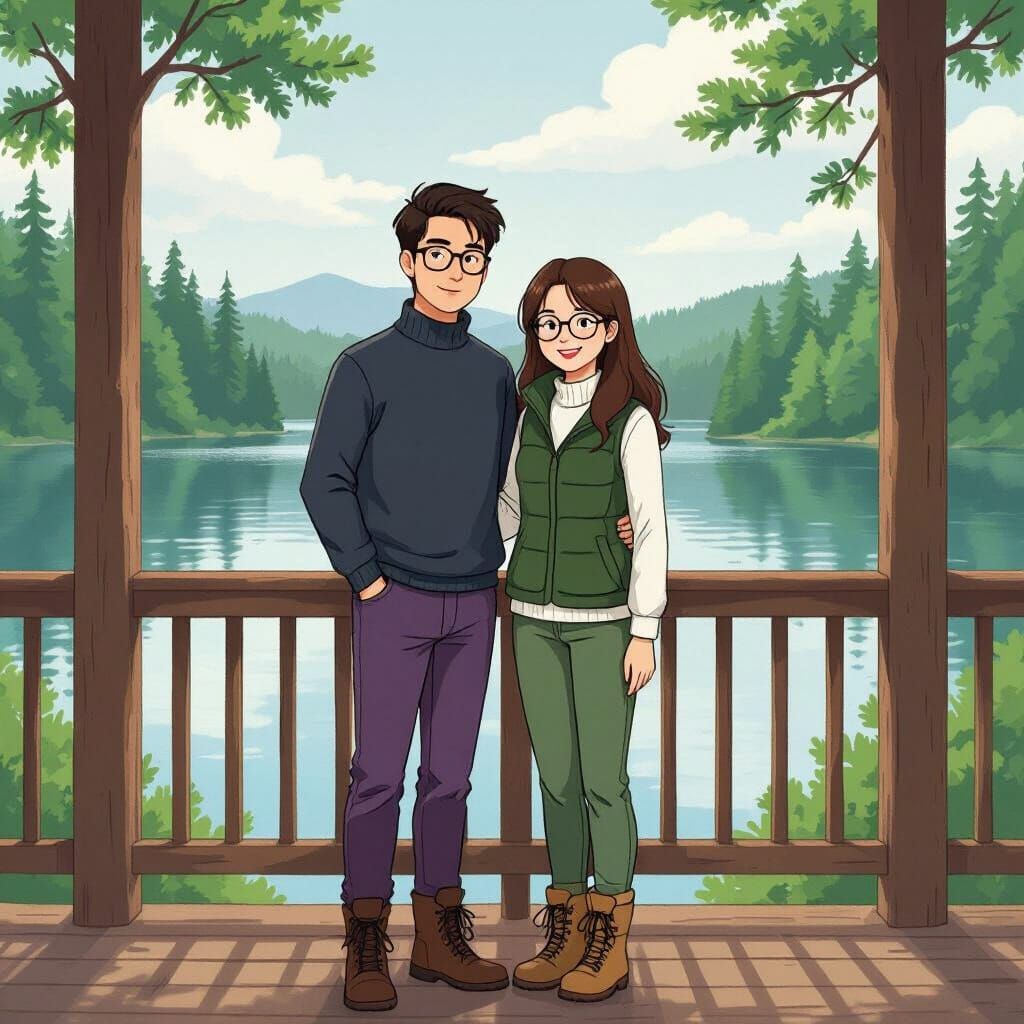 This image shows a couple on a wooden deck by a tranquil lake, encircled by lush trees, in a Studio Ghibli-inspired style. The scene evokes a serene and magical atmosphere.