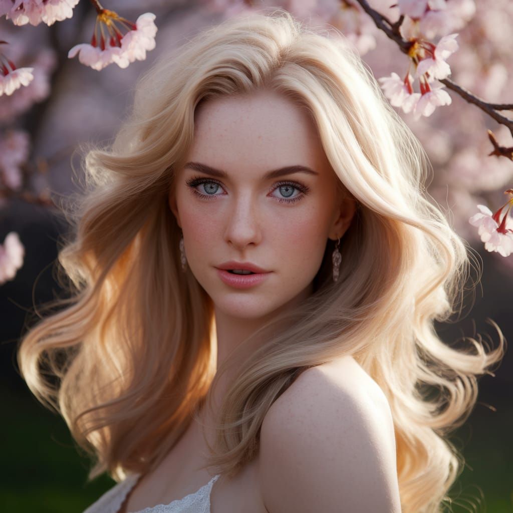 This image captures a beautiful woman with sparkling eyes and golden hair, set against a backdrop of blooming cherry blossoms, exuding a sense of serene beauty and tranquility.