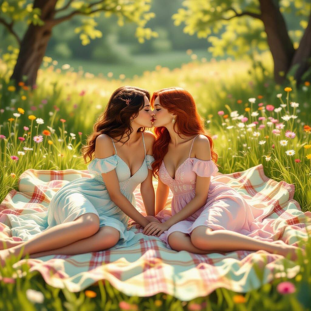 This image shows two women in pastel dresses embracing on a picnic blanket surrounded by wildflowers. The scene is bathed in warm sunlight, rendered with high contrast and psychedelic colors in a futuristic realism style.