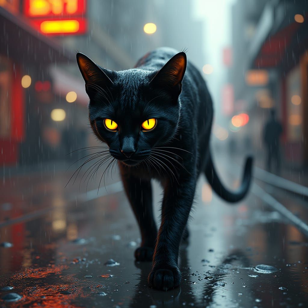 This image depicts a sleek black cat with bright yellow neon eyes navigating a rainy city street in a futuristic, cubist-inspired style, blending geometric shapes and high-tech flair with bold colors and textures.
