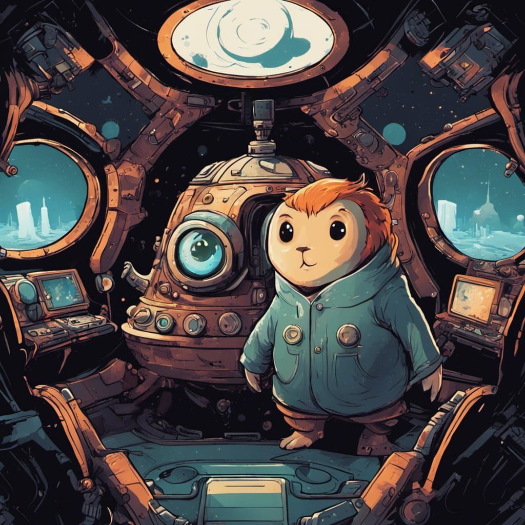This image shows a cute, adorable monster inside a spaceship, looking out of the windows at space. It's minimalist vector art in a steampunk and gothic inkpunk aesthetic.