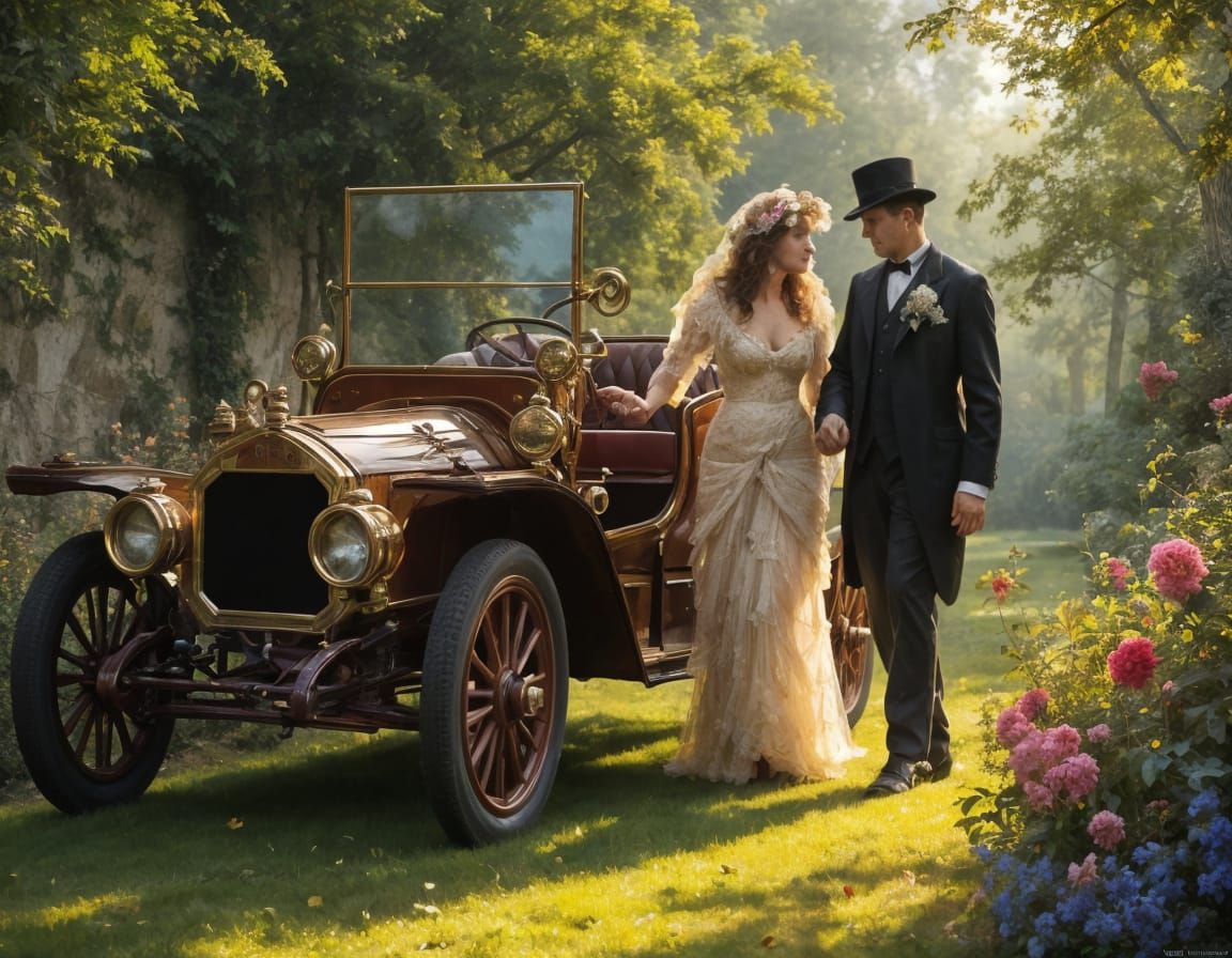 This image shows a vintage 1907 Jewel Runabout automobile. A lady and gentleman in period clothing are surrounded by greenery and floral arrangements, evoking a sense of Edwardian elegance.