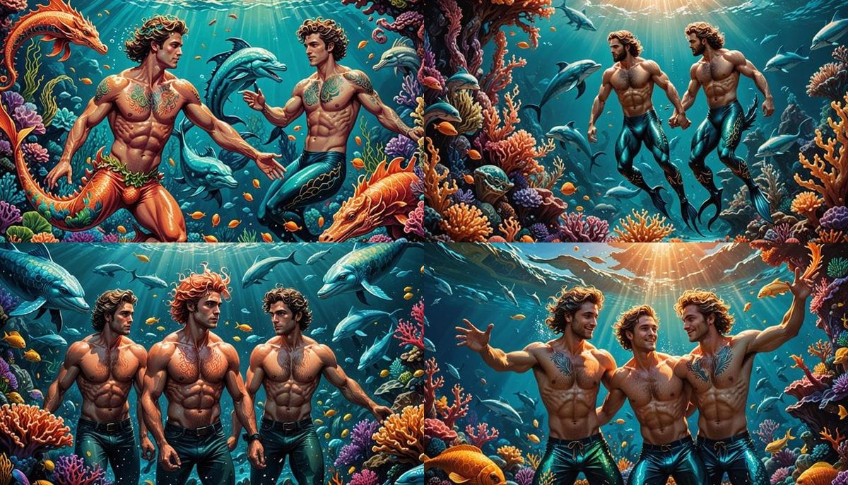 A vibrant image of two muscular mermen swimming through a coral reef. Dolphins, sea horses, and sea dragons accompany them in this ultra-detailed comic book art style.