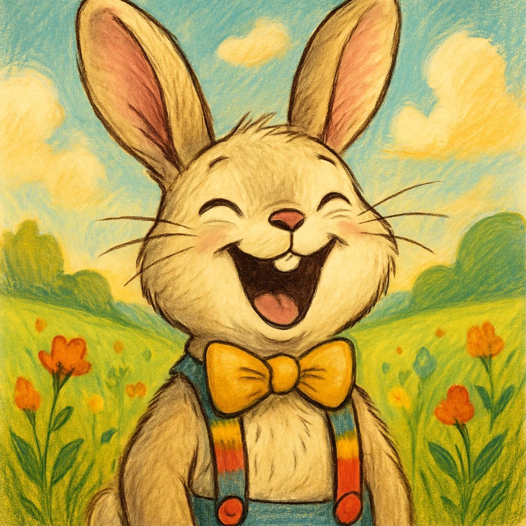 A cheerful bunny laughs while wearing a yellow bow tie and suspenders in a meadow. The image has bold lines, soft textures and warm lighting in a whimsical style.
