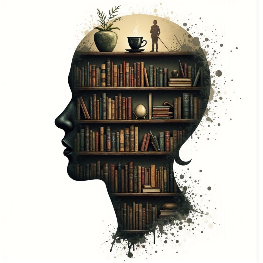 A digital illustration depicting a bookshelf laden with books beside a cup of coffee. This artwork features a human silhouette and intricate portrait design, created with ink and watercolor techniques.
