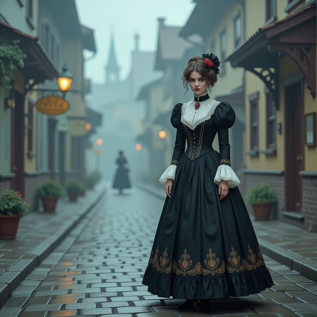 This image shows a girl in a Victorian dress standing in a misty 1900s street. The artwork blends cubist elements with symmetrical composition and a Bauhaus color palette, using soft focus and pencil sketch details.