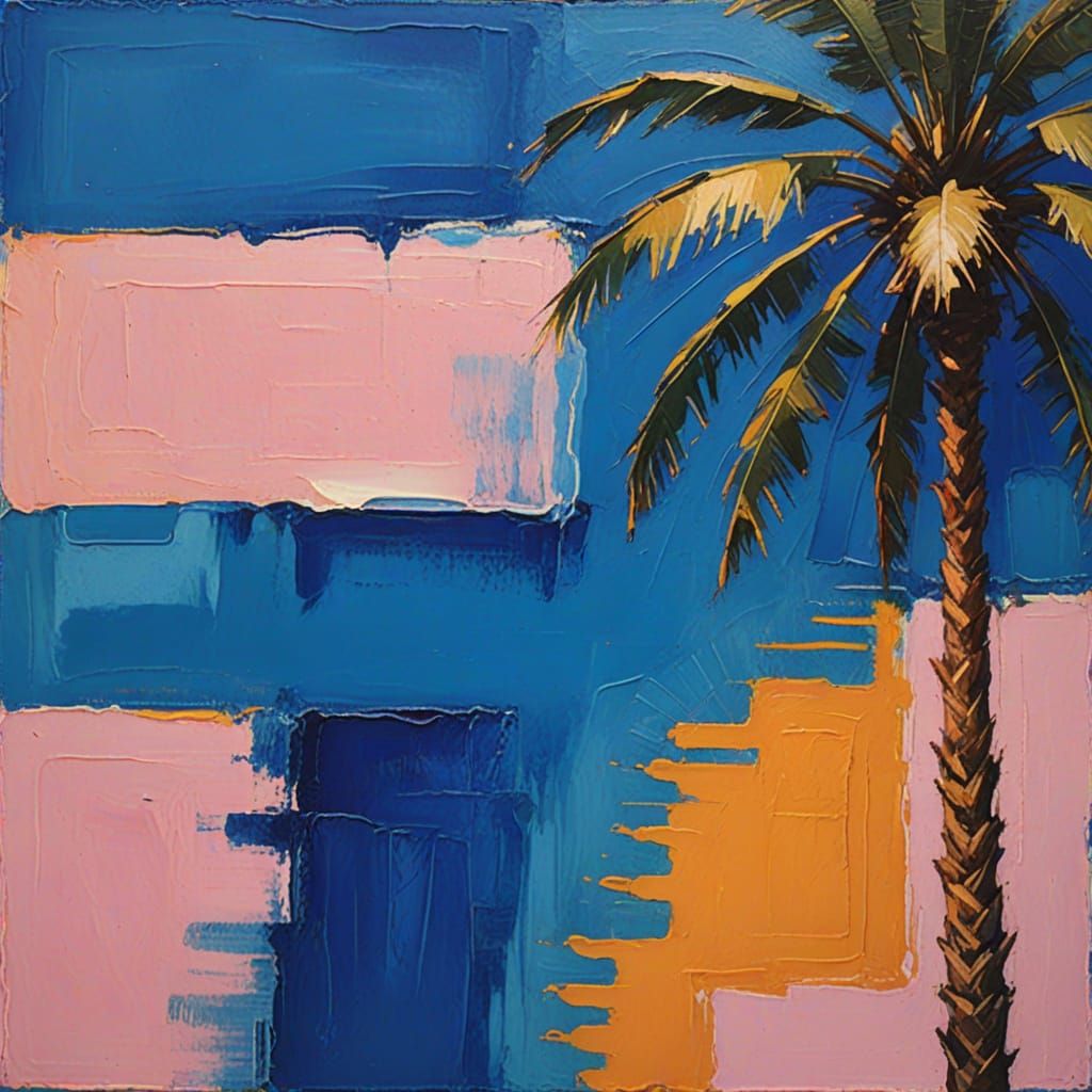 This image depicts a serene and colorful modern artwork inspired by the style of Mark Rothko, featuring a palm tree by a blue pool in warm golden light, with soft brushstrokes and vibrant ultramarine and pink hues.