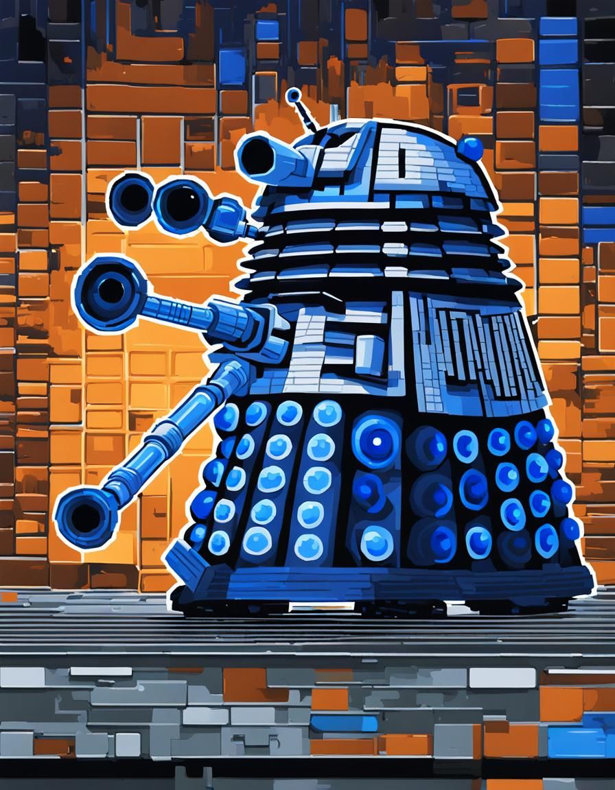 A digital illustration of a Dalek in 8-bit style. The image features pixelated metal textures, contrasting blue and grey hues, and electric blue glowing eye, with vibrant, retro-futuristic lighting.