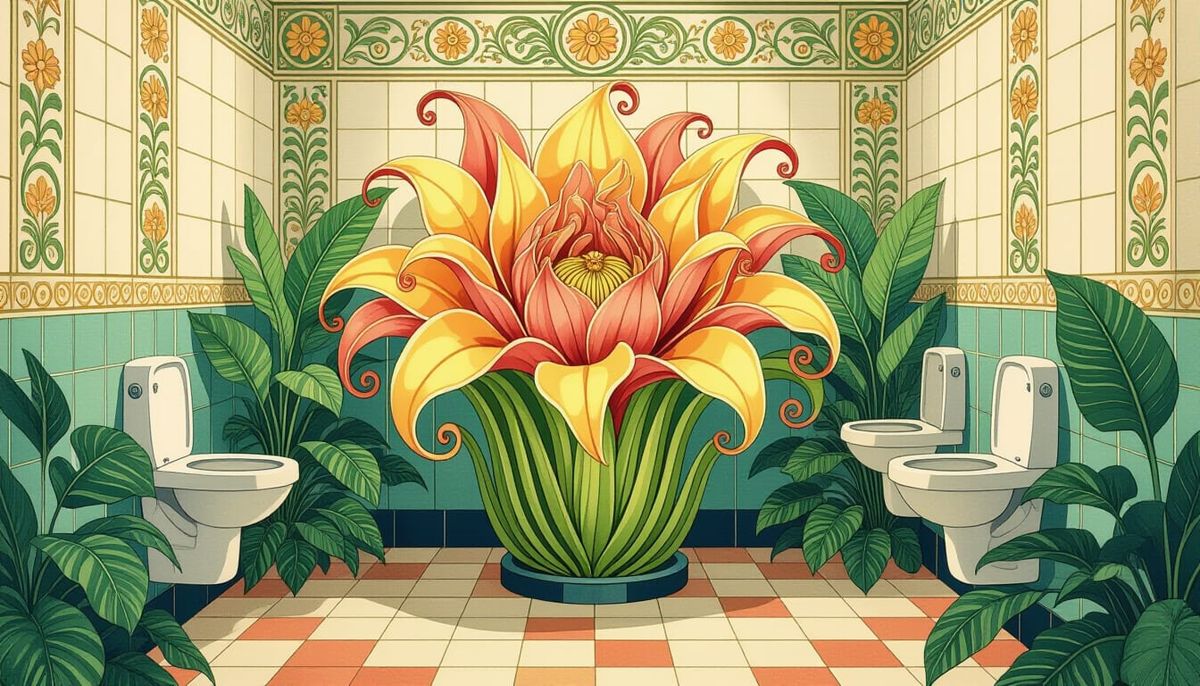 A vibrant carnivorous plant dominates a dilapidated public restroom overtaken by tropical foliage. The image is rendered with ornate Art Nouveau elements and floral motifs, using light matte gouache watercolors.