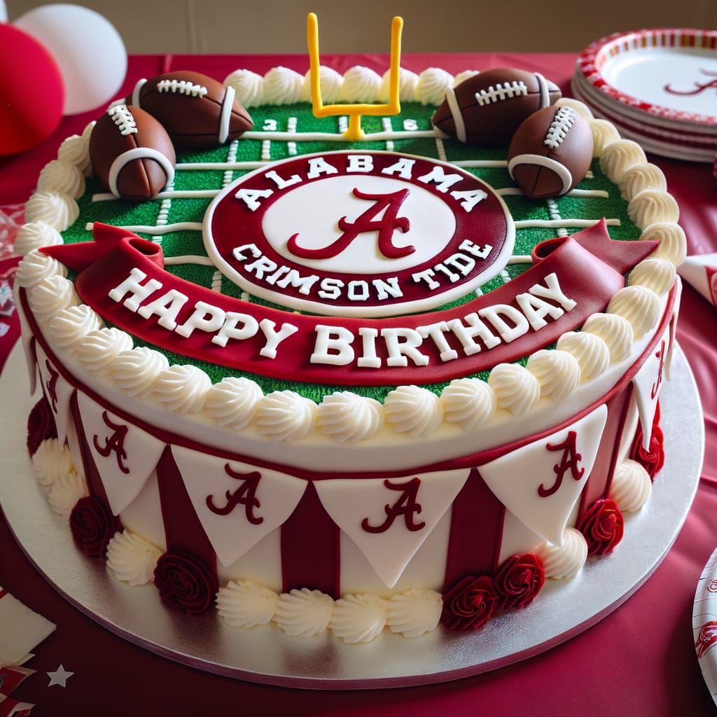 This image showcases a festive birthday cake decorated in Alabama Crimson Tide colors, featuring edible footballs, goal posts, and the team logo for a fan's celebration.