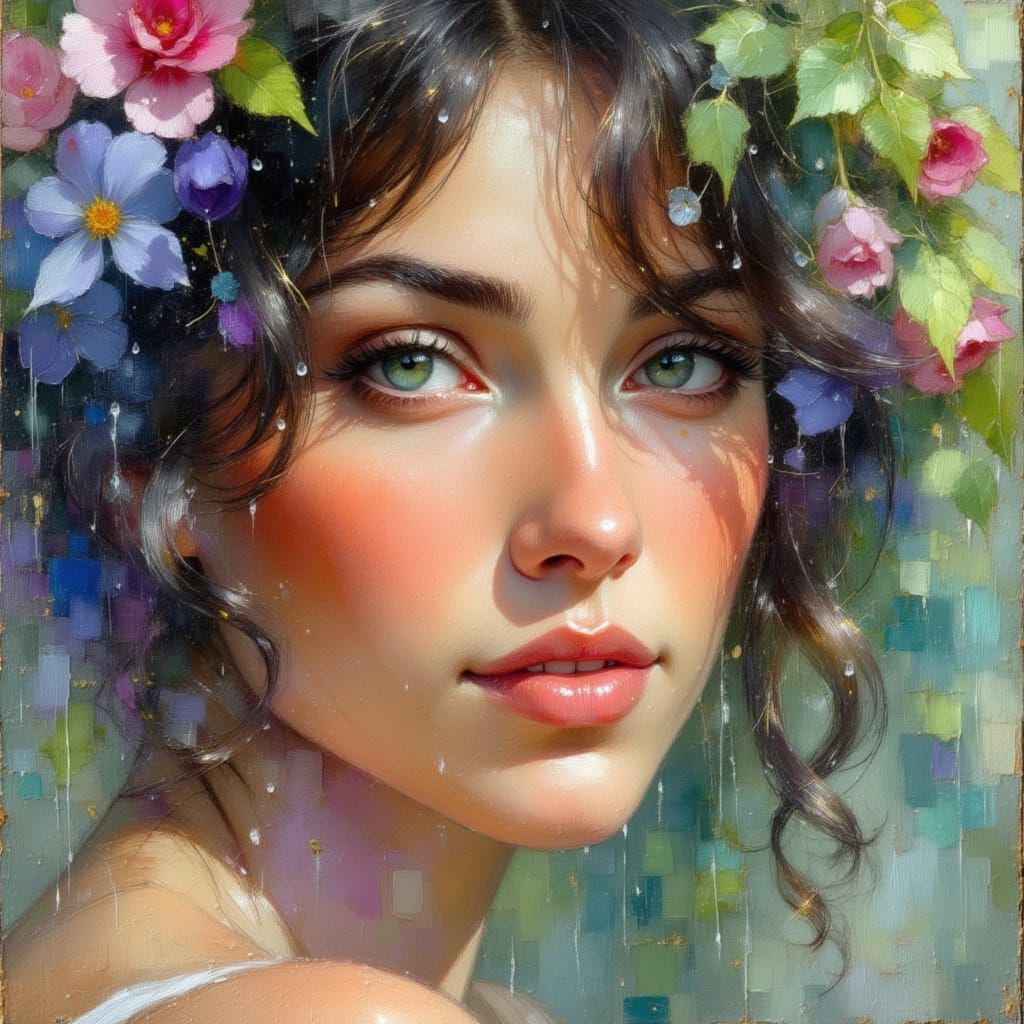 A striking close-up oil painting of a beautiful, confident woman with captivating blue-green eyes enjoying a summer rain shower. The impressionistic image captures the beauty of nature with vibrant pastel colors.