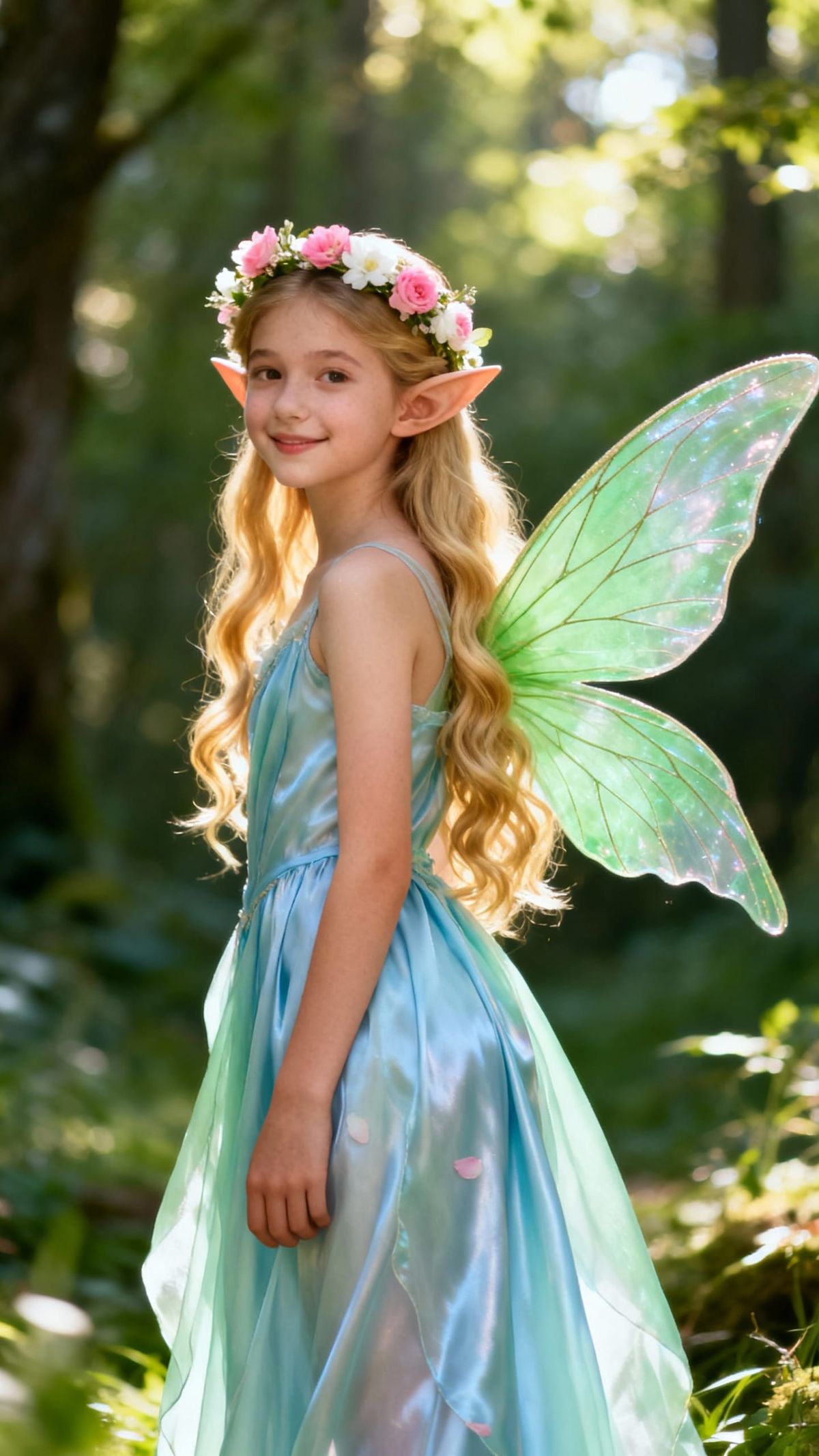 This image shows a realistic depiction of a teen fairy with flowing attire, elegant green wings, long blonde hair, and a delicate flower crown.