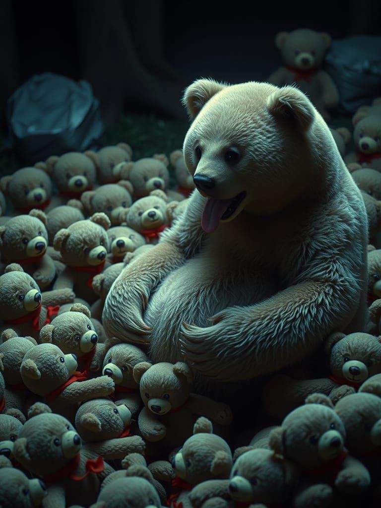 A stunning cinematic still of a pregnant bear giving birth to an endless swarm of cuddly teddy bears, shot on high-end film with rich film grain and dramatic lighting.