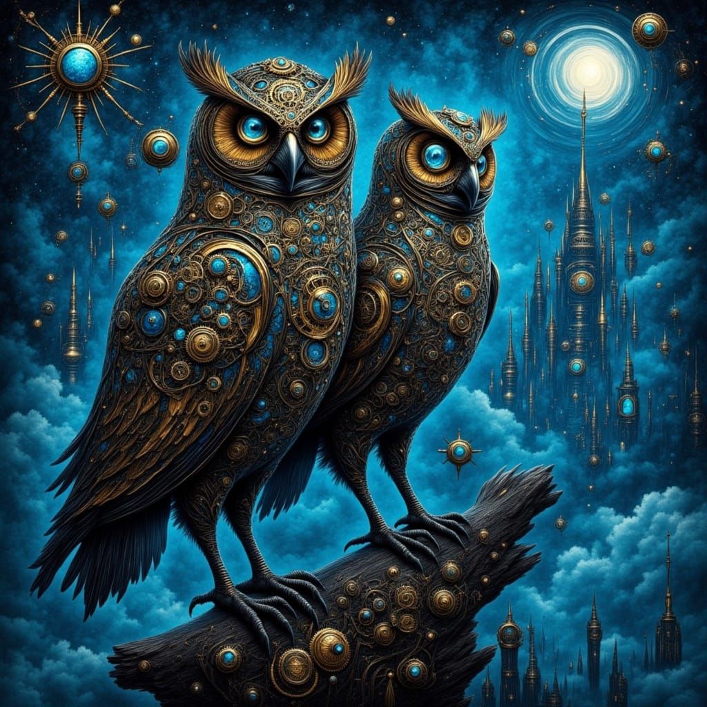 This image features mysterious owls with intricate clockwork details and art deco patterns, set against a moonlit sky with Gothic-inspired steam-powered machinery in the distance, amidst a swirling blue mist.