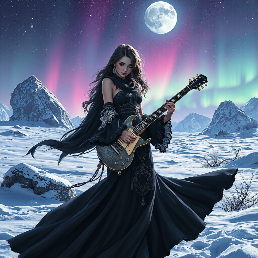 This image shows a dramatic, cinematic scene of a gothic Greek woman playing metal guitar in a snow-covered winter landscape, bathed in moonlight and aurora borealis colors, with bold lines and vibrant colors reminiscent of cel-shaded manga art.