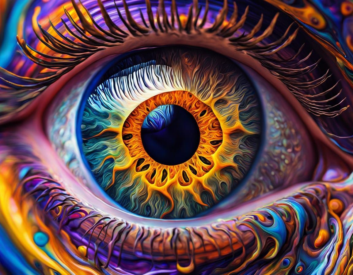 A striking picture of a close-up of a many-eyed man staring intensely. The image features vibrant expressionism, glowing irises, swirling patterns, and neon fractals in a surrealist aesthetic.