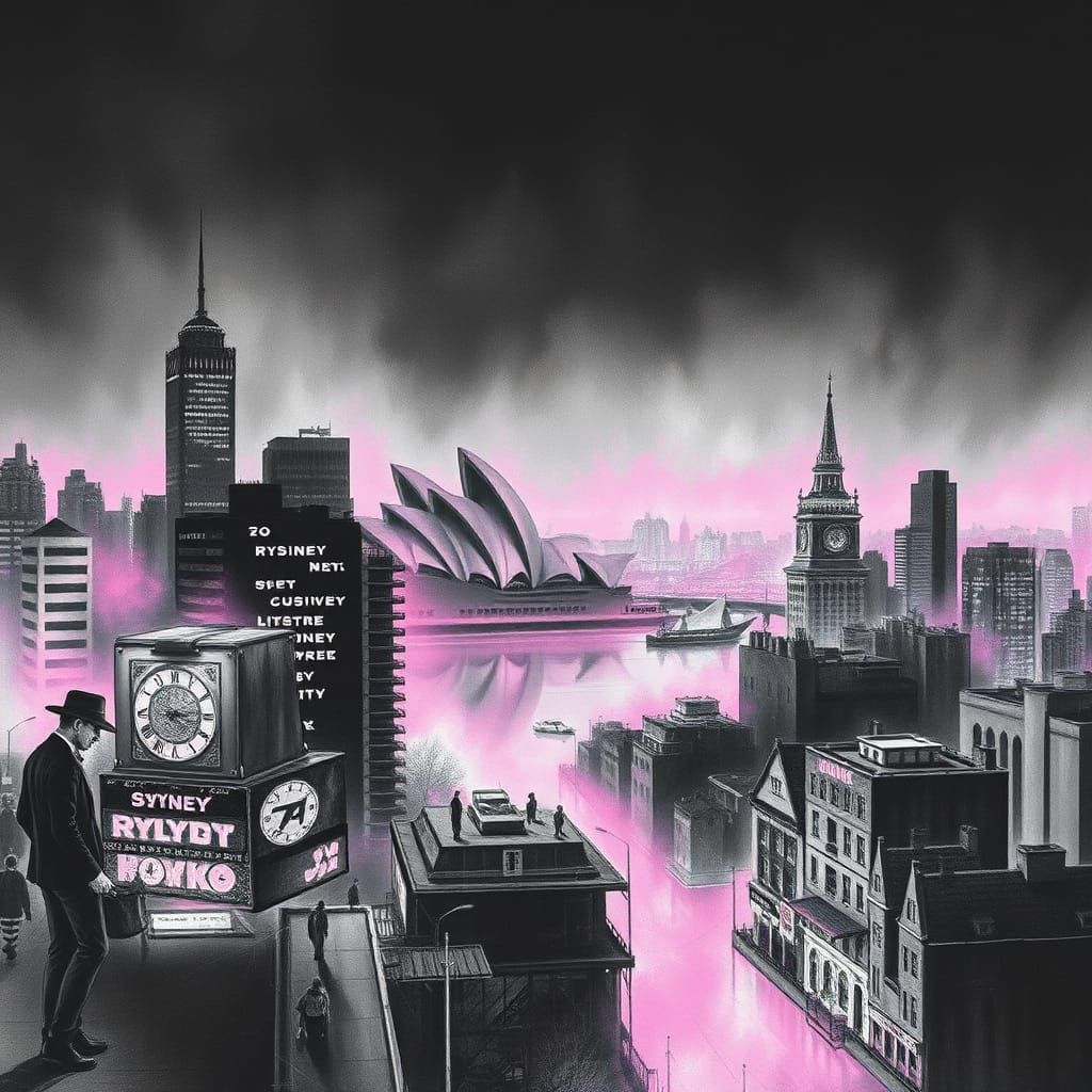 This image shows a hyperdetailed charcoal drawing of a noir scene in Sydney. The emerald city is depicted in a striking black and pink color palette.