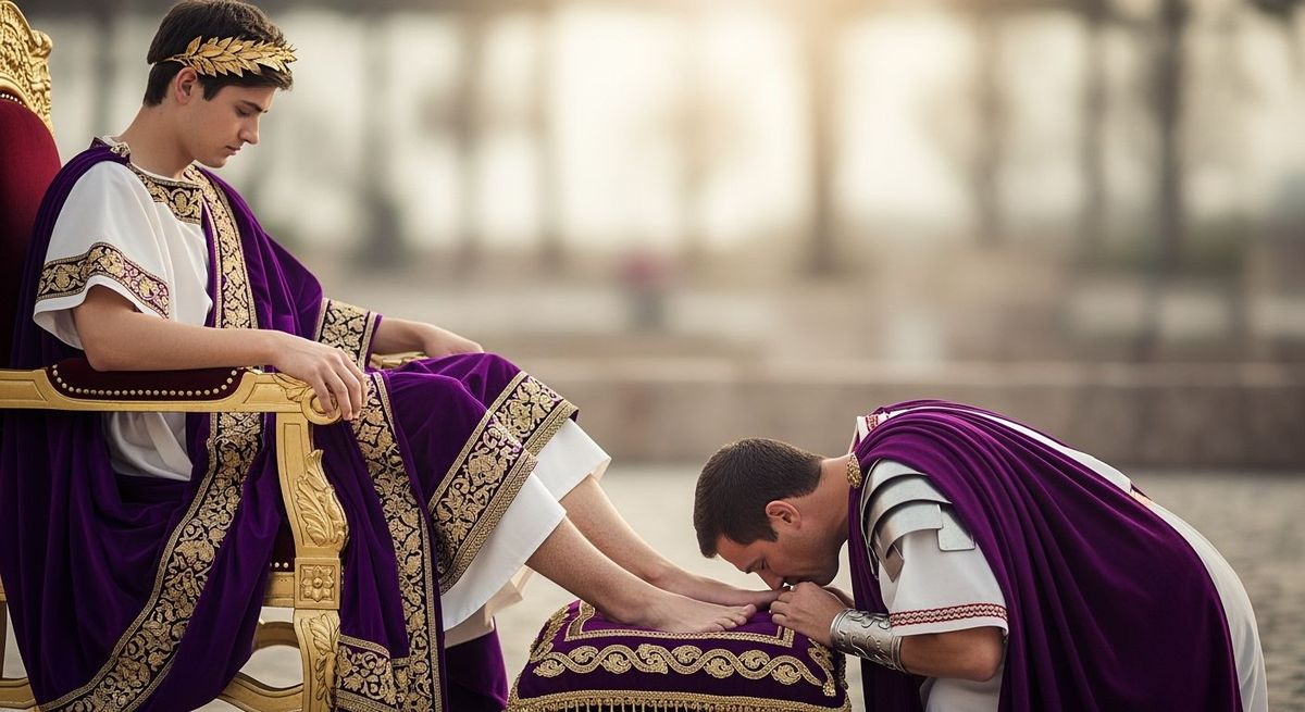 This image shows a young Roman Emperor sitting barefoot on a golden throne as a senator kneels before him. The scene is captured in sharp focus with natural lighting, creating a detailed and visually striking image.