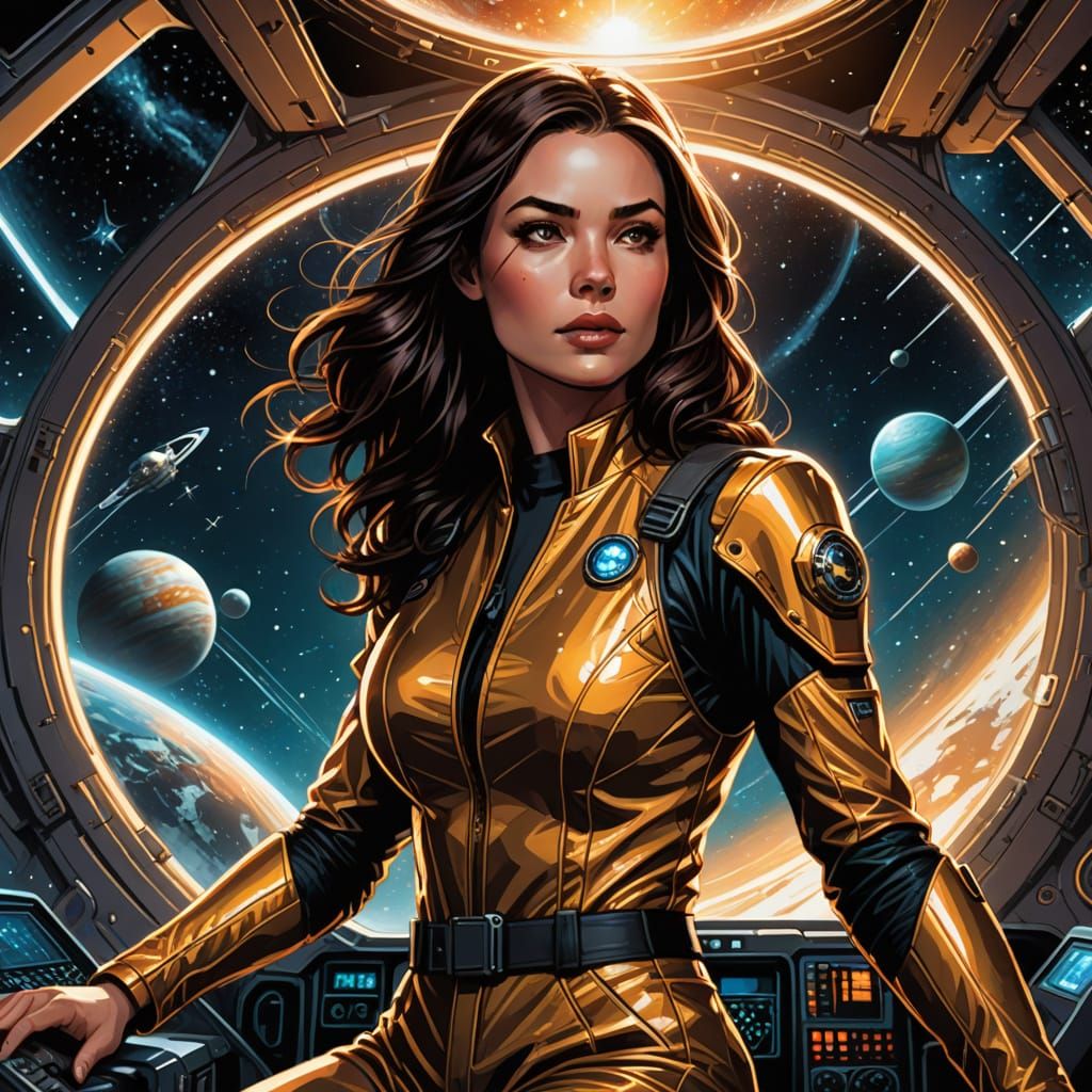This image shows a brunette woman in a gold jumpsuit confidently piloting a futuristic spaceship through the galaxy. The visual style is reminiscent of realistic comic book art with smooth lines and vibrant colors.