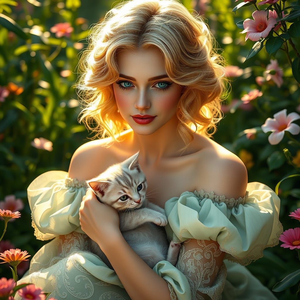 This stunning portrait of a blonde woman cradling a pale grey kitten in a lush garden is reminiscent of Art Nouveau's elegant lines and organic motifs, with vibrant colors and dynamic lighting evoking a sense of wonder and enchantment.