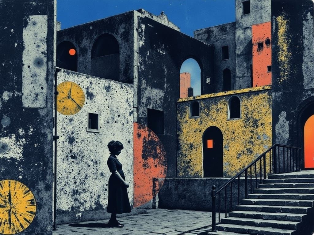 This image depicts a disorienting steampunk alley featuring intricate architecture and Escher-style staircases, rendered in a black and white geometric style with pop art elements.