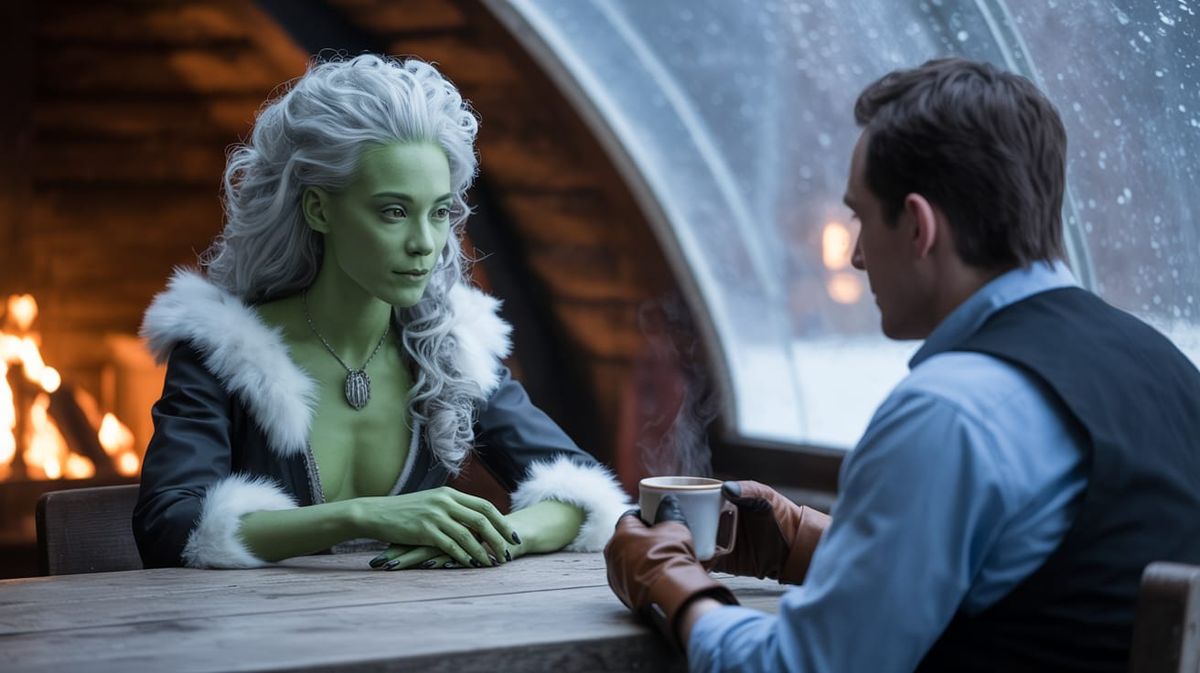 A contemplative alien woman with green skin and silver hair sits at a wooden table inside a snow-covered dome. A man opposite her holds a warm drink, illuminated by fireplace light.