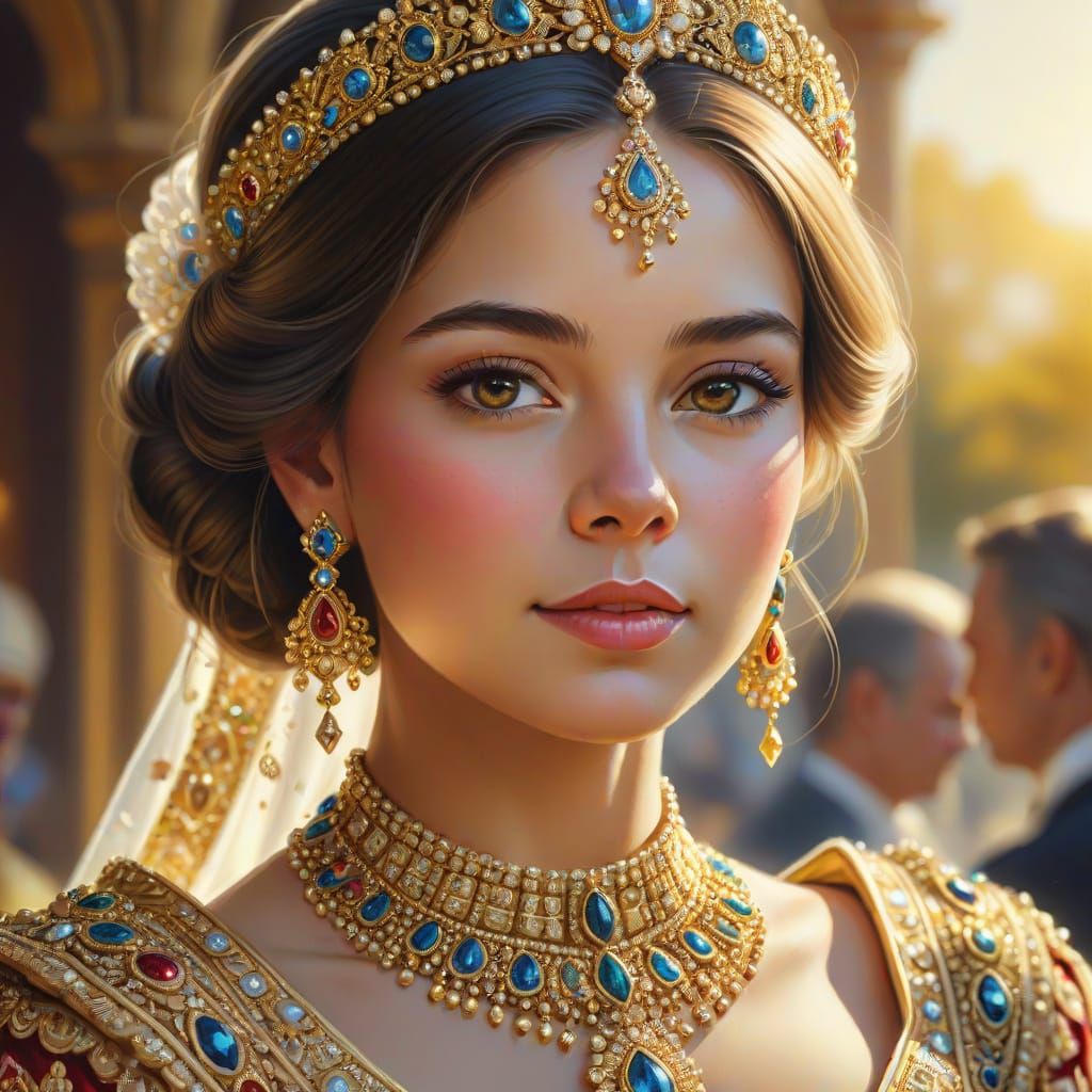 This image shows a majestic princess in traditional royal attire, adorned with intricate golden embroidery and precious gemstones, set against a warm, golden glow.