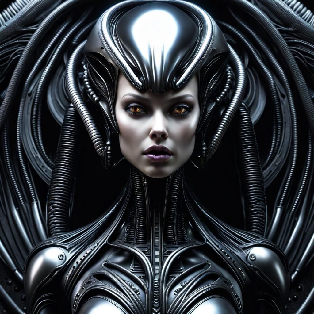 Artgem, H.R Giger; alien female. adorable, Beautiful Lighting, Photorealistic, Hyper-Detailed, Digital Illustration, Unreal Engine, 8k. drawing. zombiecore dark academia, sharp focus