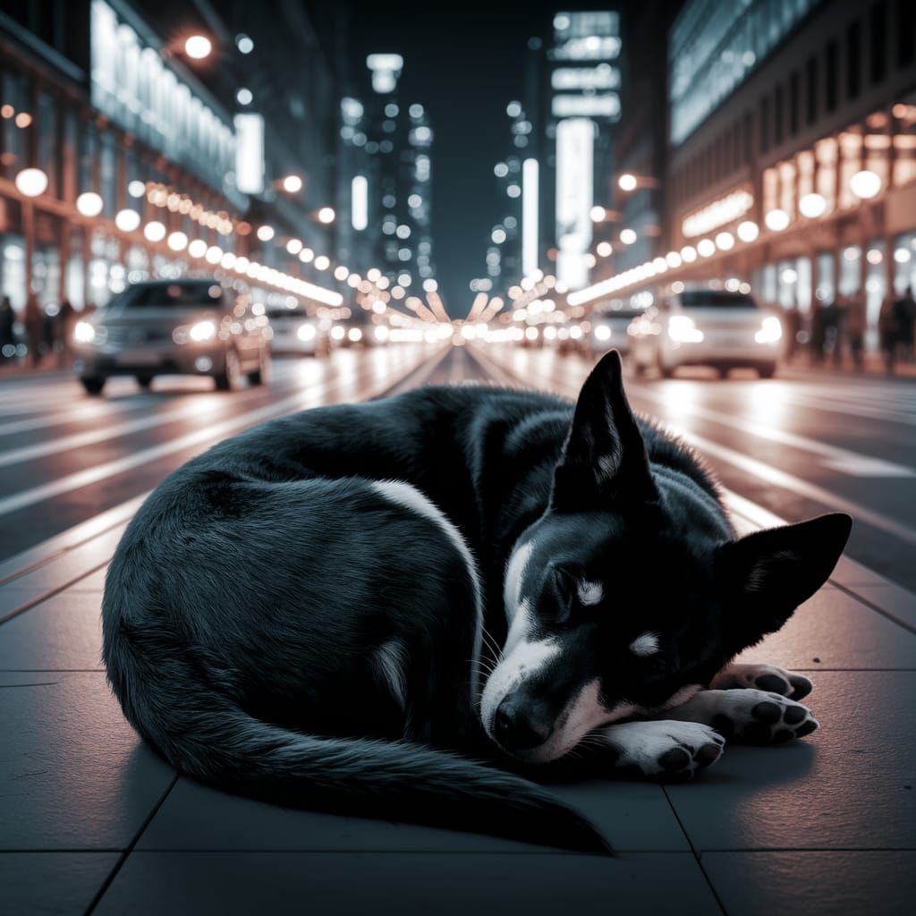 This image shows a sleeping black mixed-breed dog curled up on a busy city street at night. The high-contrast image features soft, warm hues and captures the vibrant, unnoticed canine in sharp focus.