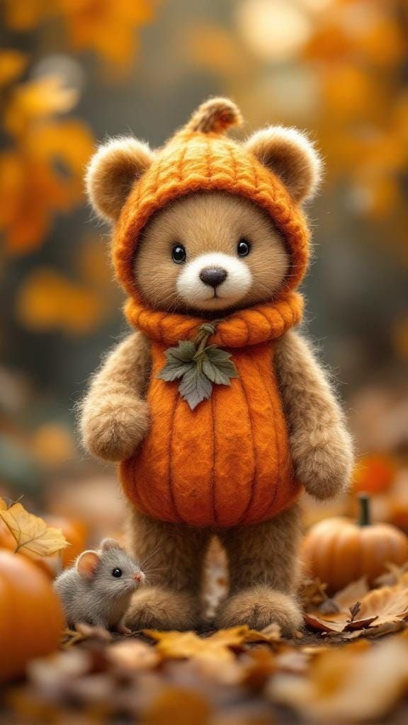This image shows a felted baby bear in a pumpkin costume amongst autumn leaves and pumpkins, accompanied by a tiny mouse. The soft lighting and textures evoke a storybook aesthetic.
