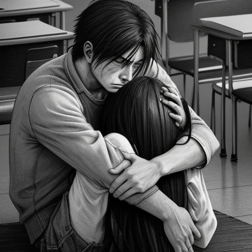 A stark, black and white anime illustration capturing a poignant moment in a classroom. A crying girl on the floor is comforted by a friend, with a boy observing.