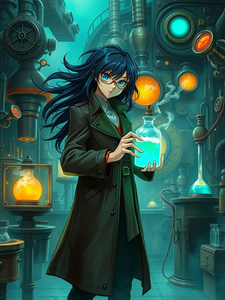 A vibrant steampunk laboratory scene shows an anime-style scientist with glowing eyes holding a vial of luminescent liquid. The image, in a steampunk aesthetic, features alien experiments, advanced tech, and intricate details.